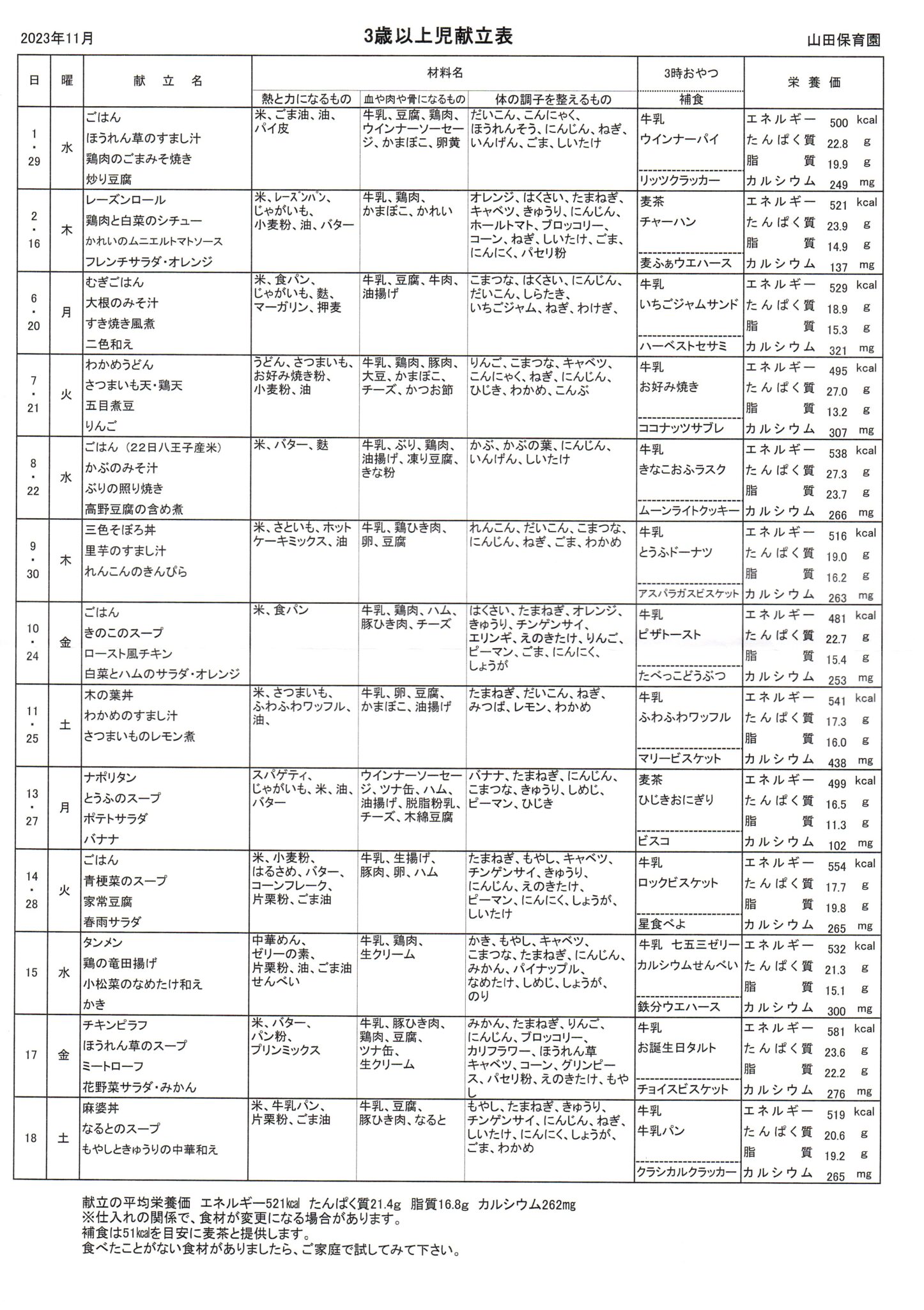 11月 3歳以上献立表