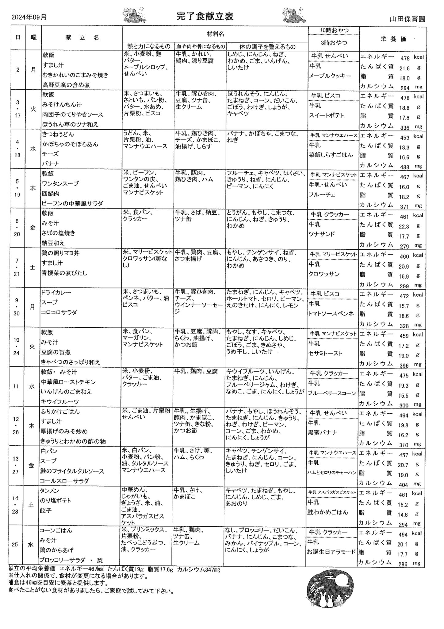 9月 完了食献立表