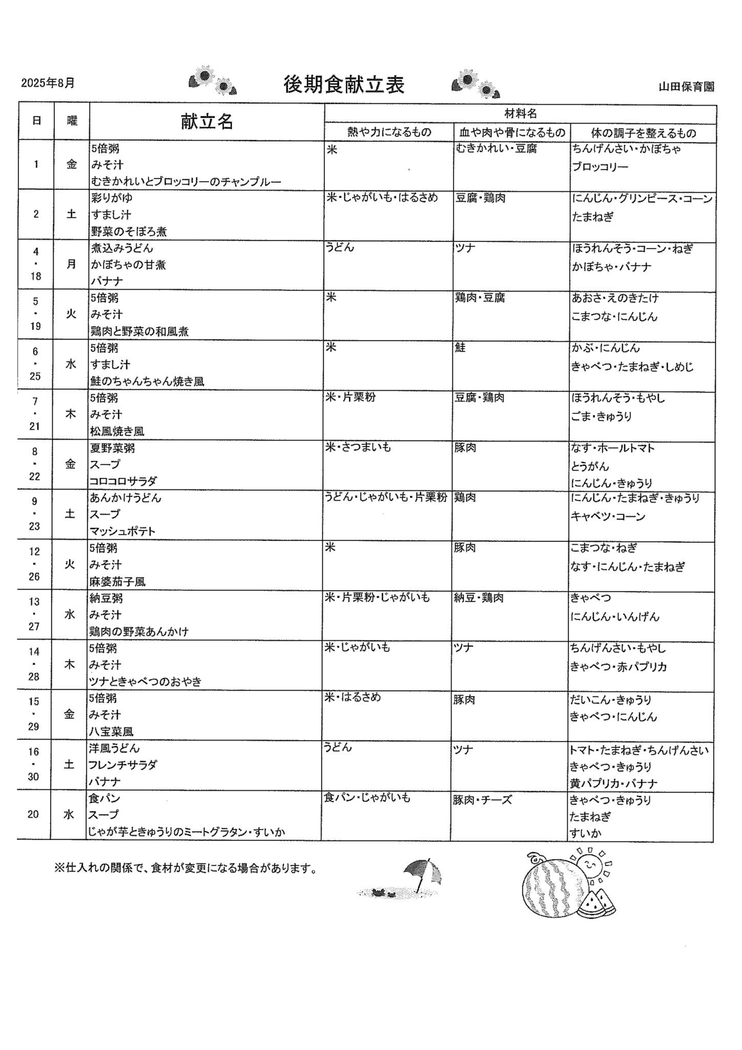 8月 後期食献立表