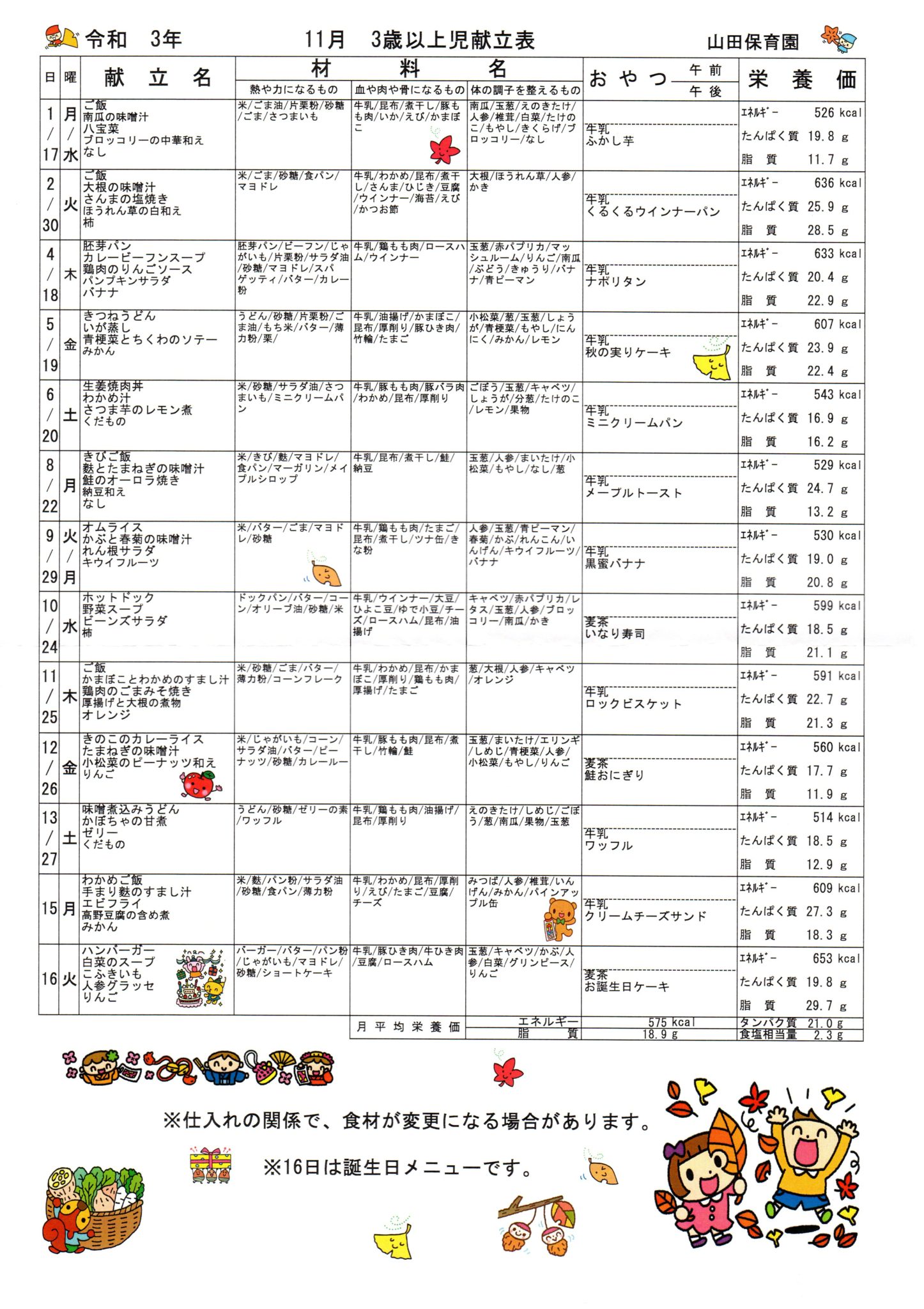 11月 3歳以上児献立表