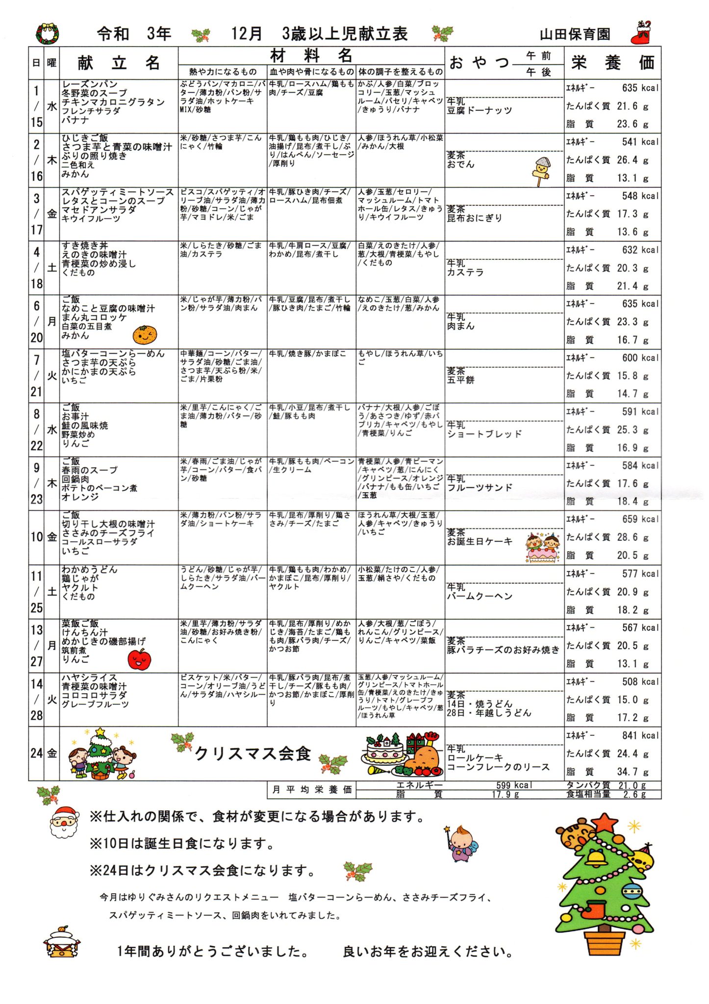 12月 3歳以上児献立表